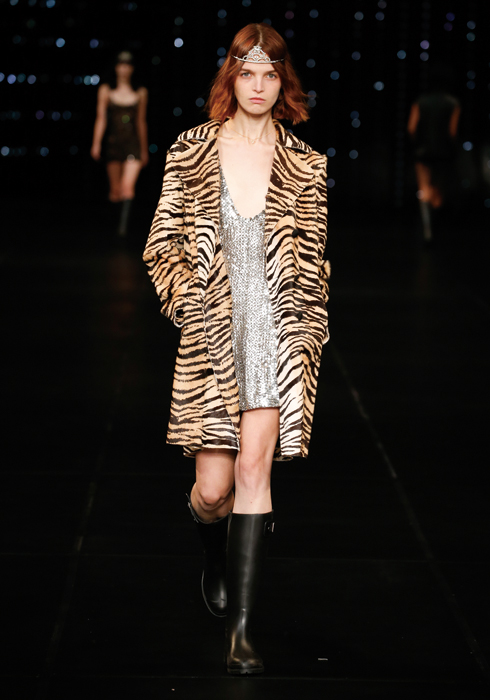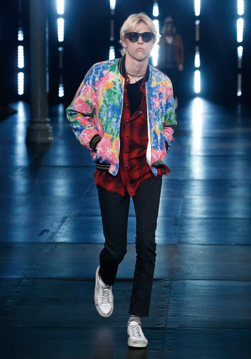앞의 글에서 예측할 수 있듯이, 이번 시즌 생 로랑의 키워드는 ‘서프 사운드’다. 에디 슬리먼이 현재 거주 중인 캘리포니아의 감성을 담아 서프, 음악, 젊음에 대해 이야기한다. 컬렉션은 1990년대 뮤지션들을 보는 듯한 빈티지한 의상으로 채워졌는데 과거에 유행했던 스타일을 현대적인 감성으로 재해석해 세련되게 믹스 매치한 스타일링이 돋보인다. 마치 빈티지 숍에서나 찾을 수 있을법한 야자수, 플라워 프린트 등의 자수 디테일이 더해진 오버사이즈 카디건이나 열댓 번은 신은 듯 빈티지한 화이트 운동화, 그리고 낡은 듯 연출한 체크 셔츠와 티셔츠의 디테일 역시 매일 입는 편안한 옷처럼 친숙하면서도 새롭다. 남성 컬렉션이 경쾌하고 신나는 록 뮤직을 연상케 한다면, ‘스킨 컬렉션’이라는 컨셉 하에 진행한 여성 컬렉션은 1990년대 스타일을 보여주는 것은 동일하지만 보다 글래머러스하고 화려한 쿠튀르적인 느낌이 강하다. 스킨 컬렉션은 사람의 피부색과 실루엣, 동물의 가죽 등 모든 종류의 ‘스킨’을 뜻하는데, 여성의 아름다운 실루엣이 돋보이는 란제리 드레스들은 파이톤 소재의 테디 재킷, 혹은 타이거 프린트의 오버사이즈 카디건 등과  함께 매치되어 유니섹스 무드를 완성했다. 더불어 티아라를 쓰고 등장한 모델들은 1990년대 찬란했던 스타의 모습을 연상케 해 1990년대 스타일의 절정을 보여주었다.