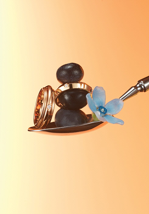 (왼쪽) 쇼메 비 마이 러브 링 아이코닉한 벌집 문양으로 이루어진 핑크 골드 밴드를 더한 링으로, 안쪽에 1개의 브릴리언트 컷 다이아몬드를 세팅해 시크릿한 감성을 불어넣었다. 2백만원대. 문의 02-2039-3854