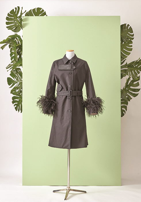 소매에 매치한, 풍성하면서도 가벼운 타조와 칠면조 깃털 장식이 포인트인 블랙 컬러 트렌치코트. 바람에 날리는 가벼운 퍼 덕분에 무거워 보이지 않고 유니크하면서 산뜻하다. 가슴과 허리에 프라다의 2018 크루즈 컬렉션 키 모티브인 고무 로고 패치를 더했다. 3백38만원 프라다.