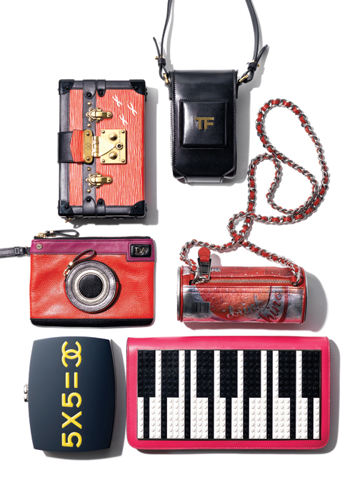 여행용 트렁크에서 영감을 받은 쁘띠드 말 클러치 겸용 숄더백. 19X12cm, 6백10만원대 루이 비통. 작은 디지털카메라도 넣을 수 있는 카메라 백. 17X9cm, 1백만원대 톰 포드. 콜라 캔 모티브를 리얼하게 재현한 체인 백. 17X8cm, 49만원 모스키노. 레고로 만든 피아노 건반 모티브가 유니크한 클러치. 28X15cm, 1백47만원 레빼띠주 by 꼬르뽀. 콤팩트 모양의 아크릴 클러치. 15.5X12cm, 가격 미정 샤넬. 카메라 모양으로 재미를 더한 클러치 백. 17.5X12cm, 23만원 DVF.