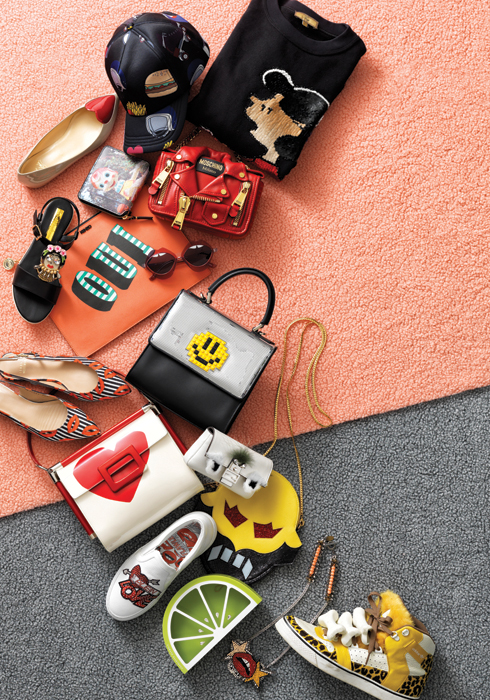 하트 모티브로 앞코에 포인트를 준 플랫 슈즈 93만원 크리스찬 루부탱. 햄버거, 프렌치프라이 등 위트 있는 일러스트가 돋보이는 모자 13만원 아메리칸 레트로 by 팬턴 컴퍼니. 스누피의 사랑스러운 루시 캐릭터를 스팽글로 장식한 스웨트셔츠 가격 미정 페이. 비즈 장식으로 여인을 형상화한 블랙 샌들 1백13만원 루퍼트 샌더슨 by 분더샵. 몽환적인 무드가 느껴지는 캐릭터 프린트의 지갑 39만5천원 꼼데가르송. 빨간 가죽 재킷 모티브의 체인 숄더백. 19X13cm,1백68만원 모스키노. 프랑스어 ‘oui’와 ‘non’의 타이포그래피를 앞뒤로 새긴 가죽 클러치. 30X22cm, 49만원 겐조. 입술 모양의 선글라스 25만원 하우스 오브 홀랜드 by 오피스 더블유. 스트라이프 패턴에 섹시한 입술 프린트를 가득 채운 미들 힐 67만원 스튜어트 와이츠먼. 레고로 만든 스마일 장식이 재미난 블랙 토트백. 21X20cm, 가격 미정 레뻬띠주 by 꼬르뽀. 큼지막한 하트 무늬로 포인트를 준 미스 비브 티셔츠 러브 컬렉션 백. 21X18cm, 가격 미정 로저 비비에. 익살맞은 백 벅스가 눈에 띄는 초미니 사이즈의 마이크로 백 벅스 바게트 백. 15X8cm, 1백77만원 펜디. 하트, 입술 모티브와 ‘LOVE’ 레터링까지 ‘사랑’을 한껏 표현한 듯 위트 있는 화이트 슬립온 1백19만원 필립 플레인. 슈퍼 히어로의 얼굴에서 압도적인 개성이 느껴지는 크로스 백. 21X23cm, 1백만원대 스텔라 매카트니. 투명한 아크릴 소재로 산뜻한 라임 모양을 완성한 유니크한 클러치. 19X11.5cm, 1백33만원 샬롯 올림피아 by 분더샵. 스톤으로 화려하게 장식한 입술 모티브의 네크리스 93만원 베나 by 무이 액세서리. 뼈 장식과 레오퍼드 패턴으로 고인돌 가족을 연상케 하는 하이톱 23만9천원 아디다스 오리지널스.