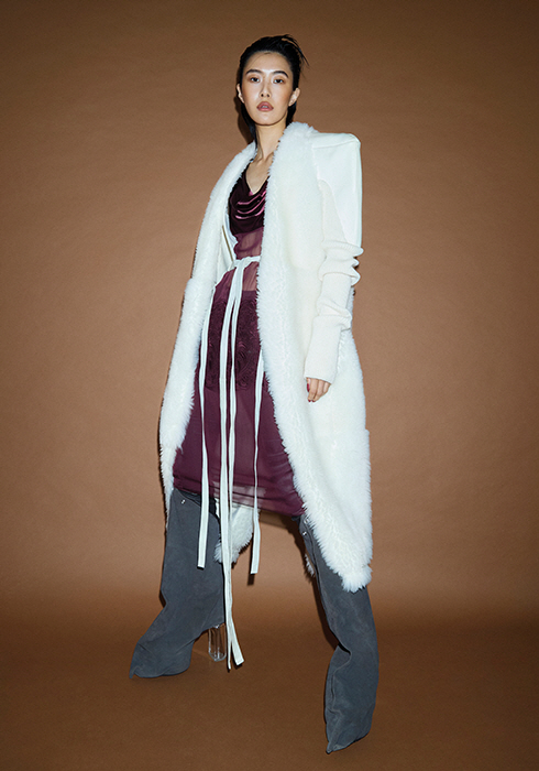 화이트 시어링 슬리브리스 코트, 레더 재킷, 스웨이드 부츠 모두 가격 미정 릭 오웬스. 버건디 실크 드레스 가격 미정 페라가모.