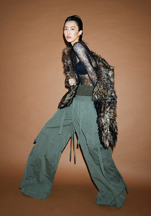 안감 퍼 디테일의 레더 코트 1천7백80만원, 레이스 보디수트 1백86만원, 왁스 파이유 팬츠 2백66만원 모두 돌체앤가바나. 글로우 드롭 이어링 27만원 그레이엘린.