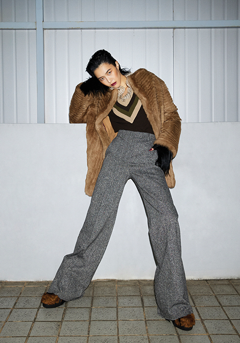 오버 핏의 시어링 코트 2천1백12만원 토즈. 그레이 재킷, 니트 톱, 레깅스 모두 가격 미정 막스마라. 그레이 니트 스커트 가격 미정 릭 오웬스. 판테아 펌프스 가격 미정 발렌티노 가라바니. 라운드 후프 이어링 21만원 그레이엘린.