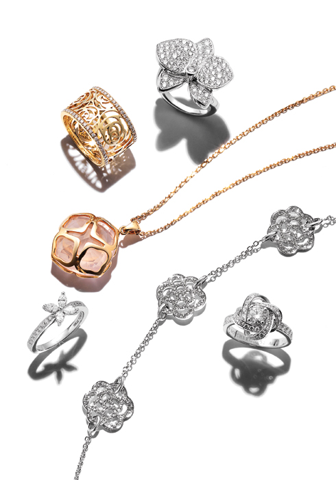 관능적인 난초 모티브에 다이아몬드를 세팅한 까레스 드 오끼에 컬렉션 링 2천1백만원대 까르띠에. 오픈워크 기법으로 옐로 골드 밴드 링에 동백꽃을 표현한 까멜리아 링 8백만원대 샤넬 화인 주얼리. 핑크 쿼츠를 소재로 기하학적인 형태의 꽃잎을 표현한 임페리얼 컬렉션 네크리스 5백만원대 쇼파드. 마키즈 컷 다이아몬드로 꽃잎을 표현한 빅토리아 링 9백만원대 티파니. 화이트 골드와 다이아몬드로 동백꽃을 표현한 까멜리아 아주르 브레이슬릿 1천1백만원대 샤넬 화인 주얼리. 작약에서 영감을 받은 아바 피브완 링. 0.5캐럿 최상급 다이아몬드를 세팅했다. 2천만원대 부쉐론.