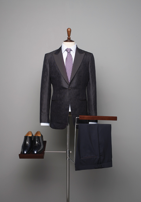 남성 예복의 가장 기본적인 형태로 안정적인 스타일만큼 대중적으로 가장 즐겨 입는 블랙 턱시도. 날렵한 새틴 라펠의 턱시도 재킷, 허리와 옆선에 새틴 트리밍을 넣은 트라우저, 촘촘하게 플리츠를 잡은 윙 칼라 턱시도 셔츠를 매치하고 보타이로 마무리한 스타일.