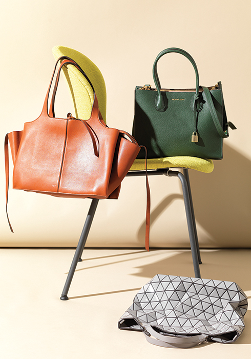 (왼쪽부터 시계 방향으로) 셀린느 트리폴드 백 세 가지 수납공간이 있다는 의미에서 이름 붙인 우아하고 부드러운 실루엣의 토트백. 내부 수납공간을 세 구역으로 분리해 소지품을 체계적으로 수납할 수 있고, 양쪽에 달린 긴 끈을 서로 묶으면 셰이프를 사각형으로 변형할 수 있다. 47X26cm 3백97만원. 문의 02-540-0486 마이클코어스 머서 백 고급스러운 그린 컬러, 미니멀한 디자인, 부드러운 페블 레더와 사피아노 패턴의 PVC를 접목해 독창적인 고급스러움을 담은 토트백. 32X25cm 69만원. 문의 02-3479-1852 바오바오 크리스탈 글로스 입체적인 3D 셰이프가 감각적인 토트백. 내부 고리를 연결해 또 다른 디자인으로 연출할 수 있다. 40X28cm 1백45만원. 문의 02-6905-3531