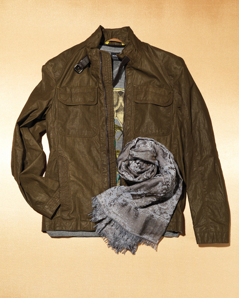 그래픽 티셔츠 25만원, 브라운 재킷 1백33만원, 에스닉한 패턴의 스카프 33만원 모두 휴고 보스.