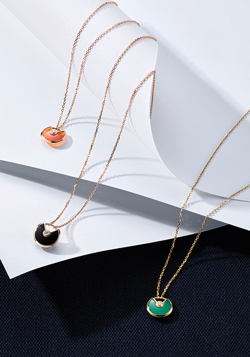 | 서약의 자물쇠를 연상시키는 심플하고도 유니크한 캡슐형 디자인에 자개, 오닉스 등 다양한 컬러와 소재의 원석, 다이아몬드를 세팅해 특별함을 더한 아뮬레뜨 드 까르띠에 네크리스. 왼쪽부터 코럴 카닐리언 2백50만원대, 블랙 오닉스 2백30만원대, 그린 크리소프레이즈 3백10만원대 모두 까르띠에. 문의 1566-7277 |