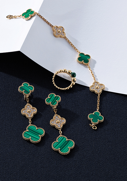 행운의 상징인 알함브라 모티브에 최상급 다이아몬드와 초록빛 말라카이트를 균형감 있게 세팅한 알함브라 말라카이트 컬렉션. 이어링 2천만원대, 브레이슬릿 1천5백만원대, 말라카이트 원석을 중심으로 사이드로 갈수록 작아지는 원형 골드 비즈 밴드가 유니크한 말라카이트 빼를리 컬러 베리에이션 링 3백만원 모두 반클리프 아펠.