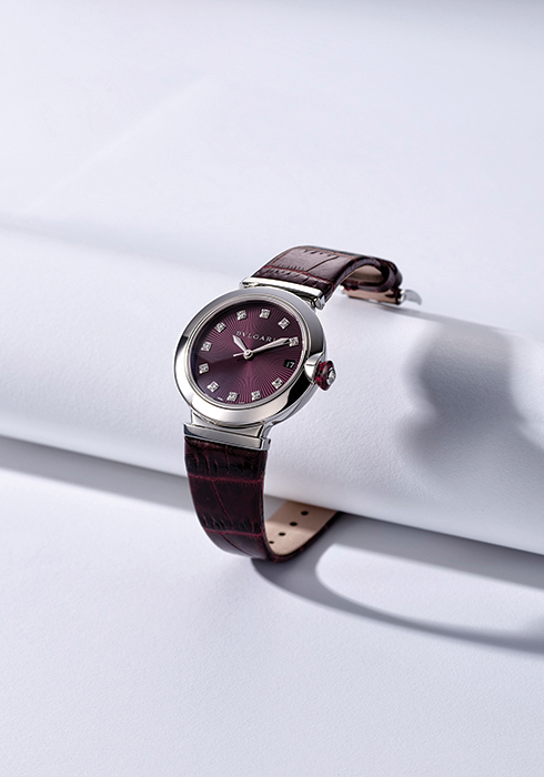 ‘빛’을 뜻하는 이탈리아어 ‘luce’와 ‘라틴어 ‘lux’를 합성해 이름 지은, 빛과 해시계에서 영감을 받은 루체아 여성 오토매틱 워치. 우아한 퍼플 색상의 악어가죽 스트랩, 다이아몬드 인덱스, 젬 스톤을 세팅한 크라운 장식이 돋보인다. 7백만원대 불가리. 문의 02-2056-0171 |