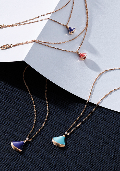 | 전설적인 여배우 엘리자베스 테일러에게서 영감을 받은 디바스 드림 컬렉션으로, 영화 <클레오파트라> 속 그녀의 강렬한 메이크업과 기하학적인 부채 모티브를 아름답게 표현했다. 위부터 블루 컬러의 라피스 라줄리 세팅의 핑크 골드 브레이슬릿 1백만원대, 레드빛 코럴 세팅의 핑크 골드 브레이슬릿 2백만원대, 블루 컬러의 라피스 라줄리와 다이아몬드를 세팅한 핑크 골드 네크리스 2백만원대, 라이트 블루 컬러의 터쿼이즈와 다이아몬드를 세팅한 핑크 골드 네크리스 2백만원대 모두 불가리.