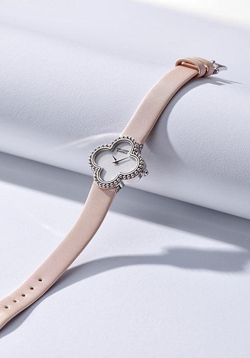 알함브라 디자인의 케이스가 사랑스러운 빈티지 알함브라 여성 워치. 화이트 골드 케이스와 인덱스를 생략한 화이트 자개 다이얼에서 심플함과 여성스러운 우아함이 엿보인다. 9백30만원 반클리프 아펠. |