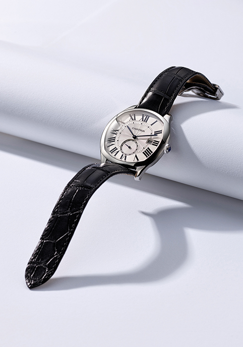 남성미가 느껴지는 세련된 라인의 쿠션형 케이스에서 개성과 품격이 드러나는 드라이브 드 까르띠에 남성 오토매틱 워치. 드라이브라는 컬렉션명처럼 라디에이터 그릴을 연상케 하는 기요셰 모티브 다이얼, 6시 방향의 카운터, 볼트 형태의 와인딩 크라운 등 자동차 부품에서 영감을 받은 디테일을 더한 것이 특징이다. 7백50만원대 까르띠에. |