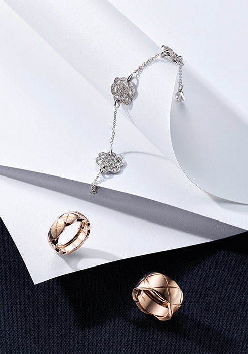 (위부터 차례대로) 탐스럽게 피어난 동백꽃 모티브에 총 0.85캐럿 상당의 1백98개 브릴리언트 컷 다이아몬드를 세팅한 까멜리아 아주르 브레이슬릿 1천만원대, 볼륨감 있는 심플한 밴드 디자인에 X자 퀼트 패턴을 더해 모던하면서도 세련된 디자인을 완성한 코코크러쉬 베이지 골드 스몰 링 2백만원대, 코코크러쉬 베이지 골드 미디엄 링 3백만원대 모두 샤넬 화인 주얼리.