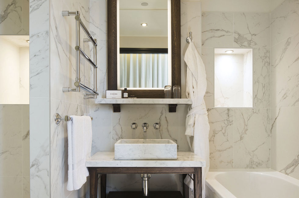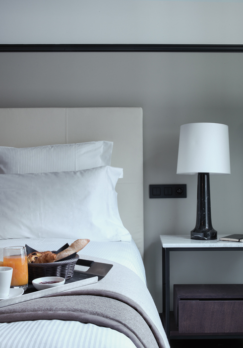“우리는 가장 북적거리는 파리 중심가에 고요함을 불어넣고 싶었어요. 실용적이면서도 우아한 공간을 창출하려고 애썼죠.” 이들의 설명처럼 몹시도 복잡한 도심에 위치한 체스 호텔은 일단 안으로 들어서면 풍경이 확 바뀌는 느낌이 들 정도로 꽤나 ‘사적인 적막’을 즐길 수 있는 곳이다. ‘체스(Chess)’라는 이름은 로비 플로어의 블랙 & 화이트 무늬에서 영감을 받아 붙인 것이다(다이닝 공간이기도 한 로비에서는 실제로 체스를 둘 수 있다). 객실은 고급스러운 진갈색 우든 플로어와 세련된 가구, 단아하면서도 앙증맞은 소품이 전반적으로는 시크하고 모던한 느낌을 창출하면서도 살짝 자연미도 풍긴다. 모든 객실에는 깔끔한 호텔 로고가 들어간 하얀색 몰스킨 노트가 놓여 있다. 목재와 대리석의 조화가 돋보이는 최신식 욕실 역시 이 호텔의 장점이다. 럭셔리한 분위기가 풍부하면서도 부담스럽지는 않은 절제미와 실용성이 조화롭게 어우러진 균형의 미학. 이것이 바로 기 & 부아지에 듀오의 ‘언어’다.