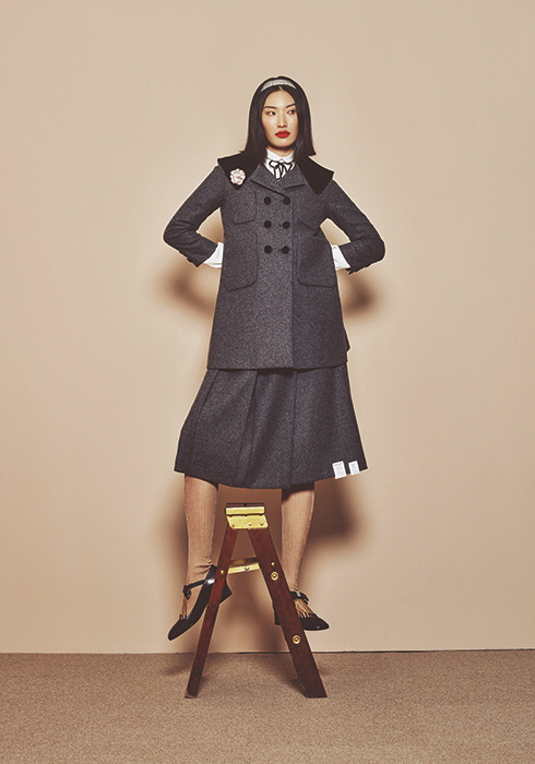 그레이 더블 코트 3백90만원, 화이트 리본 타이 장식 셔츠 1백55만원, 그레이 스커트 1백95만원, 체인 장식 블랙 메리제인 펌프스 1백70만원, 크리스털 헤어밴드 가격 미정 모두 구찌.
