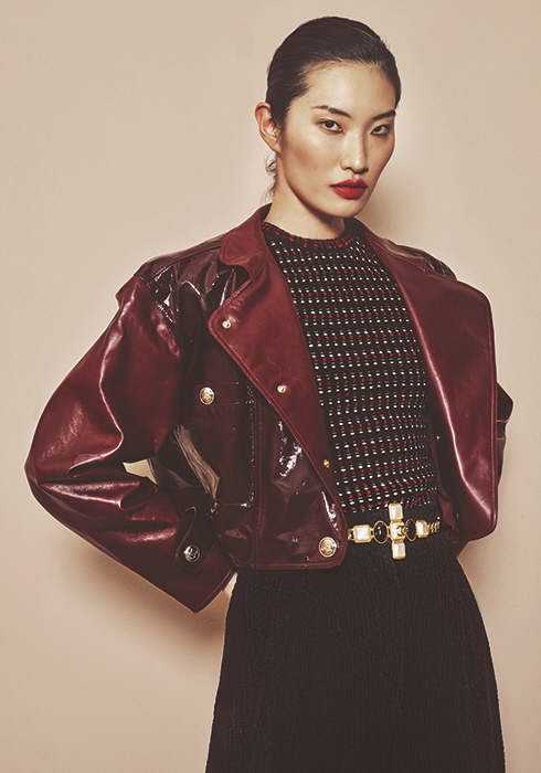 버건디 레더 재킷, 슬리브리스 니트 톱, 블랙 벨벳 팬츠, 골드 체인 벨트 모두 가격 미정 샤넬.