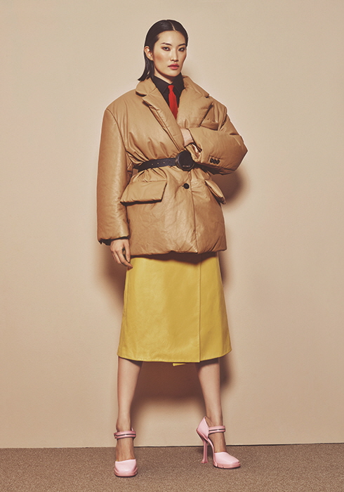 베이지 패딩 재킷 가격 미정, 블랙 슬리브리스 셔츠 가격 미정, 옐로 레더 스커트 가격 미정, 핑크 스트랩 펌프스 1백30만원대, 레드 타이 가격 미정, 블랙 벨트 가격 미정 모두 프라다.