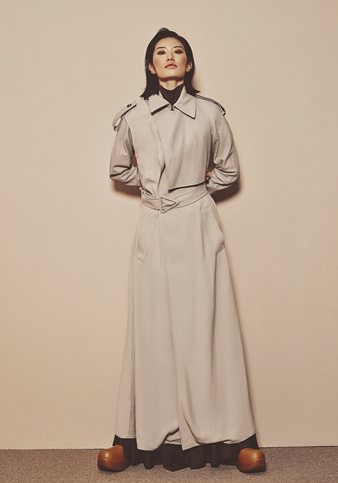 베이지 트렌치코트 7백92만원, 브라운 저지 드레스 가격 미정, 러버 부츠 79만원 모두 보테가 베네타.
