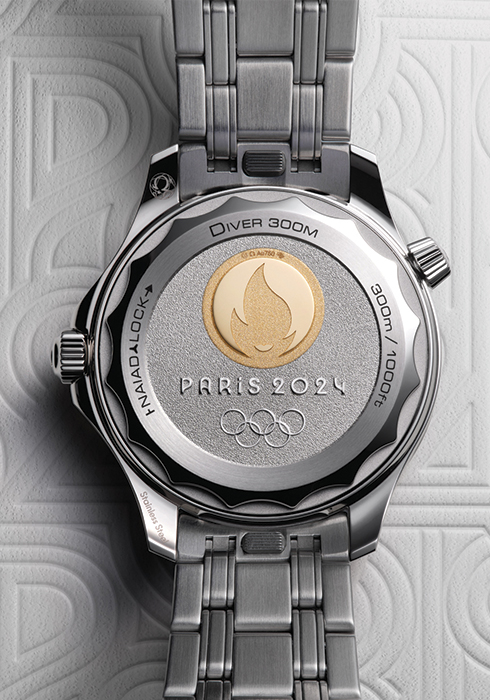 지름 42mm 스테인리스 스틸 케이스에 오메가 고유의 옐로 골드 합금인 18K 문샤인™ 골드로 케이스를 완성했으며, 레이저 인그레이빙 다이얼을 적용해 입체감을 주었다. 화이트 세라믹으로 제작된 다이얼은 매트한 마감 처리와 폴리싱 처리한 물결무늬가 양각 부조로 새겨져 있다. 베젤에는 다이빙 스케일을 더했으며 12시 방향에는 슈퍼루미노바® 싱글 도트를 레이저로 양각해 디테일한 매력을 가미했다. 6시 방향의 날짜 디스플레이에는 파리 2024 타이포그래피를 사용해 날짜를 알려주며 중앙 세컨드 핸드에는 파리 2024 엠블럼을 작게 새겨 넣어 파리 올림픽의 DNA를 완성한다. 케이스 백 역시 파리 올림픽을 의미하는 디테일을 가득 담았다. 파리 2024 엠블럼의 특징적인 요소인 18K 문샤인™ 골드 메달리온을 인레이 처리했는데, 레이저로 깎아낸 배경에 폴리싱 처리되어 있다. 여기에 스테인리스 스틸 소재를 폴리싱 처리하고 프로스티드 처리해 ‘Paris 2024’라는 문구와 오륜기 엠블럼을 완벽하게 완성했다. 브레이슬릿은 오메가의 새로운 특허 기술인 퀵 체인지 시스템이 적용된 스테인리스 스틸 브레이슬릿을 매치했으며 블루 또는 화이트, 레드 컬러의 퀵 체인지 러버 스트랩 또는 파리 2024 나토 스트랩 같은 보다 개성적인 스트랩으로 쉽게 교체할 수 있다.