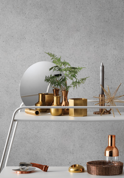 마카롱을 비롯해 핑거 푸드를 내기 좋은 디저트 접시 7만원 강희성 by 엘스토어. 적동과 실버 투톤 컬러 집게 12만원 강희성 by 엘스토어. 매끈한 조약돌 모양의 브라스 소재 티라이트 캔들 홀더 10만원대 강희성 by 엘스토어. 적동 소재의 와이어를 꼬아서 만든 원형 바스켓 5만9천원 하우스닥터 by 에잇컬러스. 풍부하고 진한 맥주 거품을 만드는 맥주 거품기 6만8천원 메누 by 에이치픽스. 모든 상품을 진열한 가느다란 스틸 소재의 트롤리 59만5천원 SMD by 에이치픽스.