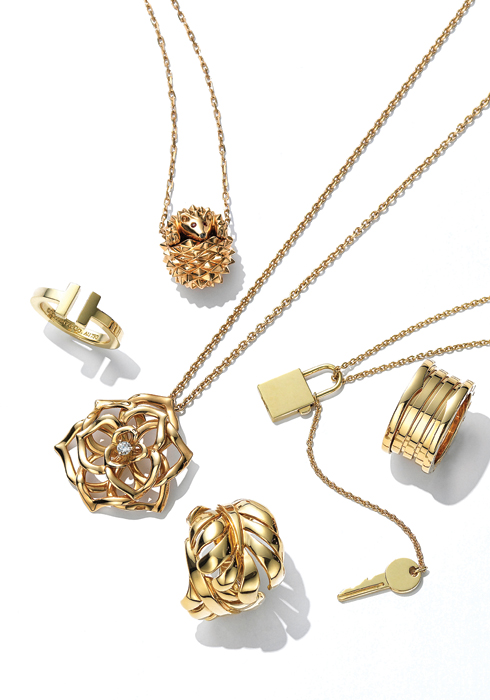 최고의 금 세공력을 보유한 부쉐론의 고슴도치 모티브의 한스 핑크 골드 펜던트. 가격 미정 부쉐론. 모던하고 간결한 디자인으로 세계적인 인기를 얻고 있는 티파니 T 스퀘어 링 1백만원대 티파니. 오픈워크 방식으로 장미 꽃잎을 표현한 피아제 로즈 네크리스. 6백70만원 피아제. 옐로 골드로 유려하게 깃털을 표현한 플룸 링 7백만원대 샤넬 화인 주얼리. 자물쇠 모티브로 사랑의 구속을 표현한 아 시크릿 네크리스. 3백60만원대 타사키. 브랜드를 대표하는 나선형 모티브의 옐로 골드 비.제로원 컬렉션. 2백만원대 불가리.