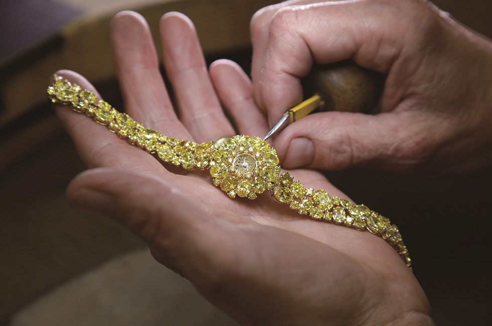 옐로 다이아몬드는 매우 희소한 보석으로, 균일하고 선명한 컬러를 갖춘 최고 등급 원석을 만나기 쉽지 않다. 그 때문에 모든 면을 충족하는 그라프의 옐로 다이아몬드가 인정받는 것. 올해 바젤월드에서 소개한 팬시 비비드(최고 등급) 옐로 다이아몬드 워치는 총 두 피스다. 시계 전체에 총 32.36캐럿의 다이아몬드를 세팅한 오벌 다이얼 형태 시계와 59.25캐럿의 다이아몬드로 장식한 라운드 다이얼 형태의 시계. 미묘한 컬러 차이에 따라 스톤을 일일이 구별한 후 케이스에서 브레이슬릿으로 갈수록 점차 밝아지도록 세팅해 화사함을 강조했고, 스톤 하나하나 조금씩 다른 각도로 세팅해 더 환한 광채를 발산하도록 고안한 점 또한 특별하다.