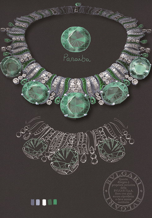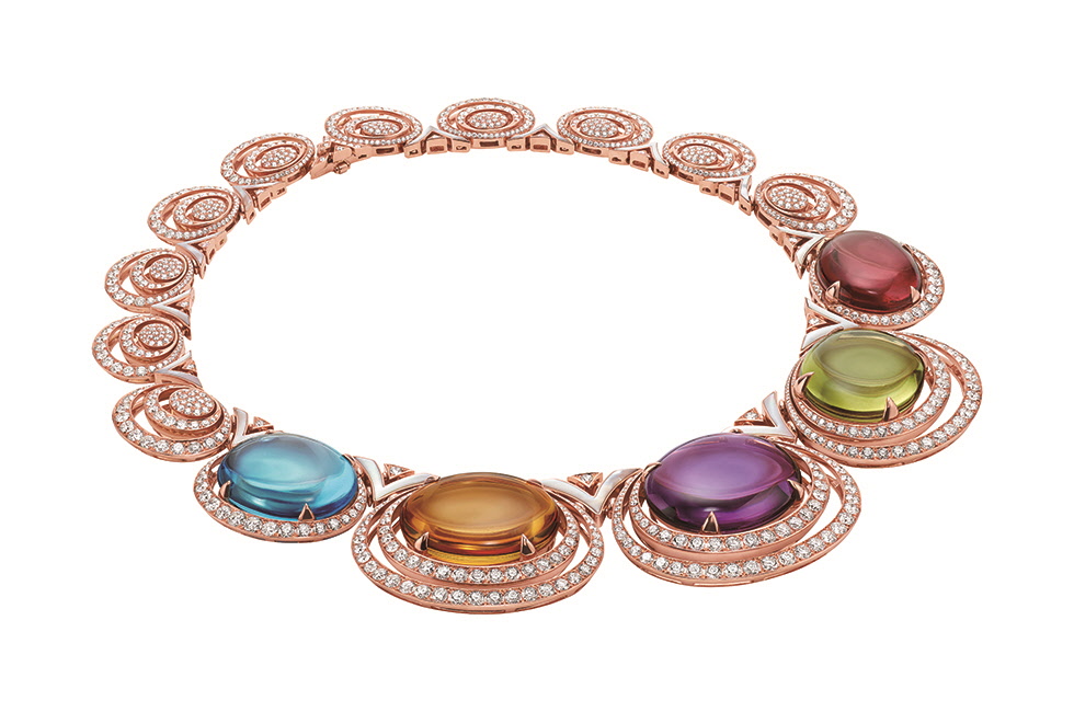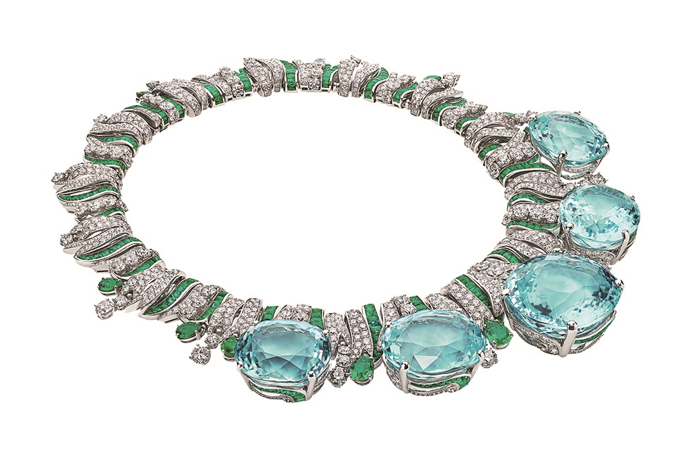 골드와 다이아몬드의 구조가 바다의 파도를 연상시키는 이 제품은 1969년에 선보인 불가리 네크리스를 재해석한 모델이다. 제작에만 무려 2천4백 시간이 소요된 이 네크리스는 로마 주얼러의 대담하고 과감한 애티튜드를 표현한다. 총 5백 캐럿에 달하는 5개의 오벌 쿠션 컷 파라이바 투르말린을 카보숑 컷 에메랄드와 다이아몬드로 유려하게 감싸 곡선미를 강조했다. 맑은 지중해 바다를 연상시키며 순수함과 신선함을 담아낸다.