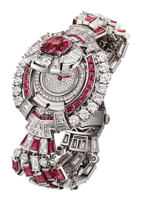 불가리의 장인 정신과 스위스 워치메이킹 노하우를 결합해 선보이는 하이엔드 워치. 플래티넘을 바탕으로 6.3캐럿의 앤티크 쿠션 컷 루비를 시계 커버에 올려 시선을 이끈다. 이탈리아의 매력적인 노을 빛을 연상시키는 강렬한 레드 톤이 바게트 컷 루비, 다이아몬드와 앙상블을 이루며 유기적으로 정교하게 연결된 브레이슬릿은 손목을 관능적으로 감싼다. 불가리 보석 세공 기술의 진수를 여실히 느낄 수 있는 쿼츠 무브먼트를 탑재한 시크릿 워치다.