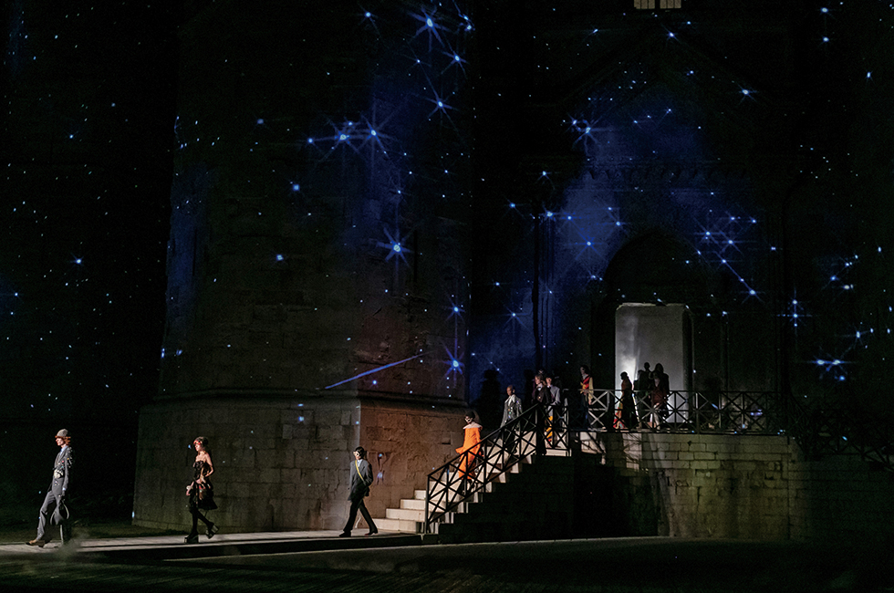 1 거대한 무대 위의 연극 같았던 구찌의 2023 크루즈 컬렉션의 피날레. 성벽에 비친 별자리 조명이 신비로움을 극대화한다.