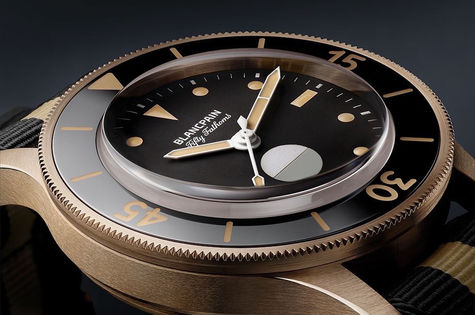피프티 패덤즈를 기념하는 이 세 번째 타임피스가 미국 해군이 사용했던 1세대 모델에서 영감을 받았다는 사실은 한눈에 알아볼 수 있다. 수분 표시기가 있는 매트 블랙 다이얼에서부터 빈티지 슈퍼-루미노바(Super-LumiNova®) 인덱스, 블랙 세라믹 인서트가 장착된 단방향 회전 베젤, 빈티지 슈퍼-루미노바 다이빙 스케일, 바다에서 수거한 어망을 재활용한 소재로 초기 모델의 색상 스타일을 재현한 투톤 나토(NATO) 스트랩에 이르기까지, 두 시계의 긴밀한 관계가 돋보인다. 한 가지 차이점은 케이스의 소재. 밀스펙 워치가 저먼 실버로 제작된 반면, 피프티 패덤즈 70주년 기념 Act 3 워치는 9K 브론즈 골드 소재다. 구리가 함유되어 있어 ‘브론즈’라는 이름이 붙은 브론즈 골드는 9K 골드(37.5%)와 구리(50%) 외에도 실버, 팔라듐, 갈륨으로 이루어진 특허 합금 소재로, 핑크 톤이 감도는 색상과 심미적 가치가 돋보이는 이 소재는 전통적인 브론즈와 달리 피부에 직접 닿아도 되며, 골드가 함유된 덕분에 청록색으로 변색되는 산화 현상 없이 오래 유지된다고 알려져 있다. 이처럼 새로운 피프티 패덤즈 워치는 군용 시계의 DNA를 고스란히 간직하면서도 현대의 용도를 고려한 타임피스로 마니아들의 관심과 애정을 받기에 충분하다. 5백55점 리미티드 에디션으로 선보이는 피프티 패덤즈 70주년 기념 Act 3는 워치 케이스도 역사적인 방수 카메라 케이스에서 영감받은 디자인으로, 블랑팡의 해양 보호 프로젝트를 반영했다. 실제로 수중 사진 촬영은 다이빙 워치의 개발과 함께 활기를 띠게 되었고, 이는 심해 세계의 발견으로 이어졌다. 두 시대를 아우르는 최고의 기억이 담긴 이 타임피스는 세계 최초의 진정한 다이빙 워치의 역사를 계속해서 써 내려갈 것이다. 우리가 블랑팡이라는 이 파워풀한 브랜드를 더욱 지켜봐야 할 이유다.