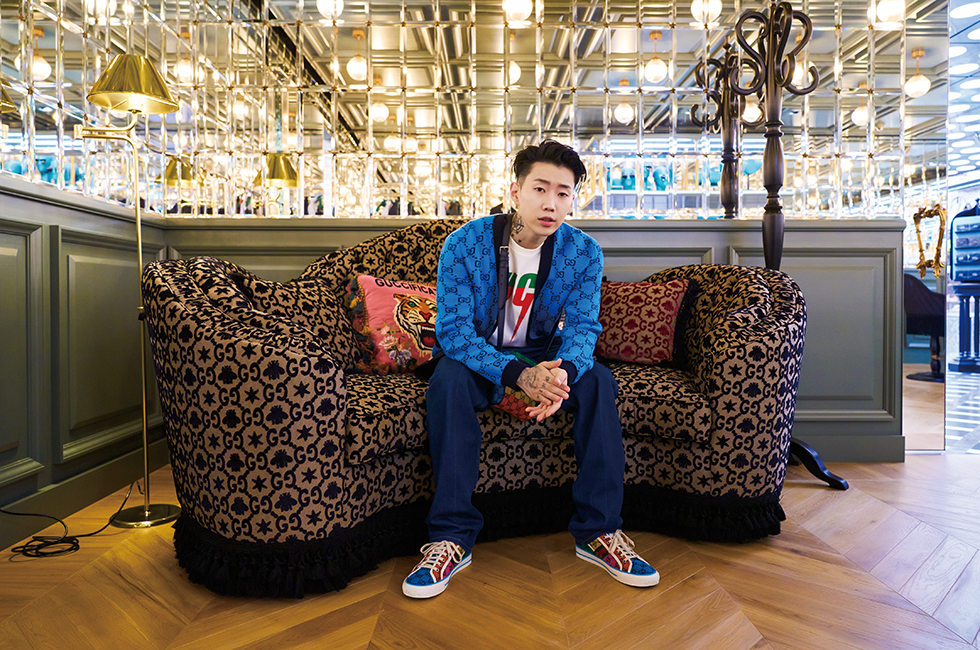 데님 팬츠에 티셔츠, GG 멀티컬러 카디건, 스니커즈, 스몰 캔버스 숄더백을 매치한 박재범.