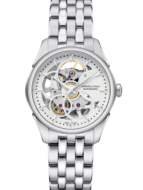36mm 케이스에 스테인리스 스틸 소재를 적용했고, 오픈 다이얼로 디자인해 개방형 로터, 배럴 드럼과 메인 브리지를 모두 관찰할 수 있다. 또 이지 클릭 스트랩 기법을 적용해 밴드를 쉽게 교체할 수 있다. 남성을 위한 해밀턴 재즈마스터 뷰매틱 스켈레톤 젠트도 함께 출시했는데 여성용과 동일한 무브먼트를 사용한 ‘솔 메이트’라 할 수 있다. 슈퍼 루미노바 소재 야광 인덱스를 사용해 어두운 곳에서 가시성을 높였다. 남성용 여성용 모두 가죽 밴드는 1백47만원, 메탈 밴드는 1백57만원이다.