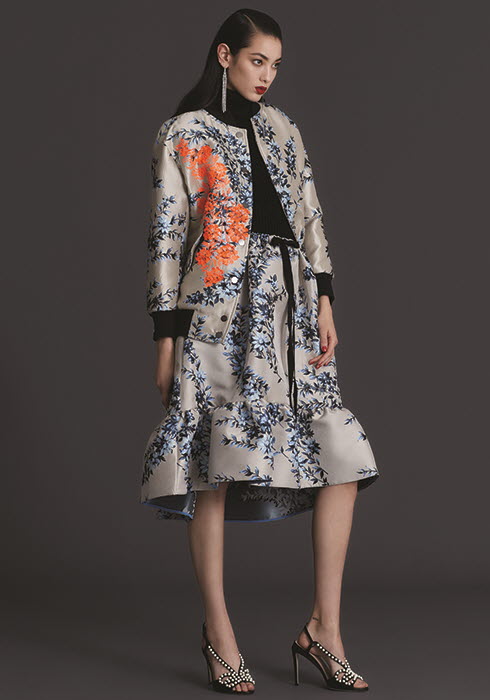베이지 플라워 패턴 재킷 3백88만원, 플레어스커트 1백86만원, 진주 장식 스트랩 힐 1백32만원 모두 펜디.