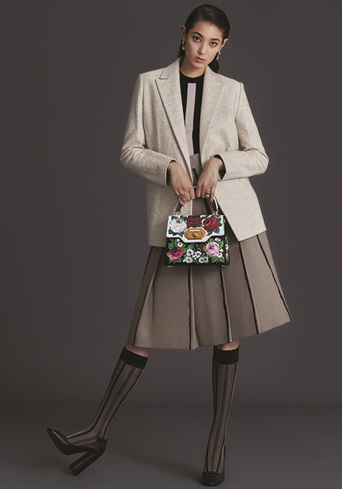 스트라이프 톱, 베이지 플레어스커트, 시스루 스타킹, 블랙 펌프스 모두 가격 미정 보테가 베네타.