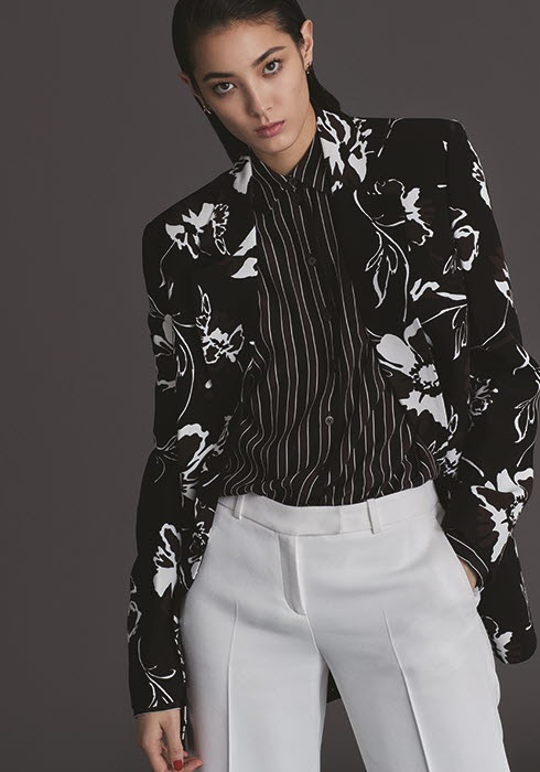 블랙 플라워 패턴 재킷 2백80만원, 스트라이프 셔츠 1백60만원, 화이트 팬츠 1백90만원 모두 마이클코어스 컬렉션.