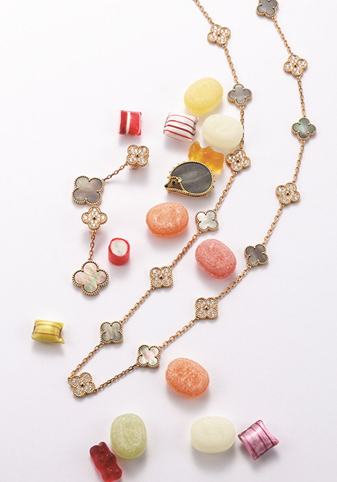 네 잎 클로버에서 영감받아 탄생한 반클리프 아펠의 알함브라 주얼리 컬렉션은 그 자체로 행운을 상징하는 아이콘이다. 핑크 골드 체인에 그레이 머더오브펄과 다이아몬드를 세팅한 버전의 알함브라 모티브 20개를 엮은 빈티지 알함브라 롱 네크리스 8천만원, 매직 알함브라 이어링 2천만원, 옐로 골드에 그레이 머더오브펄, 타이거 아이, 그리고 오닉스를 세팅한 럭키 애니멀즈 에리송 클립 파우나 8백만원대. 모두 반클리프 아펠. 문의 1668-1906