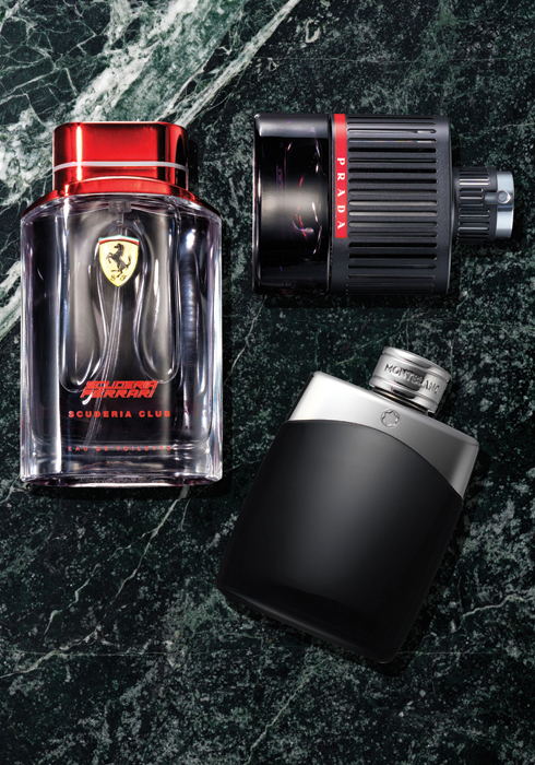 (왼쪽부터 시계 방향으로) 페라리 스쿠데리아 클럽 오드 투왈렛 40ml 5만9천원. 프라다 루나로사 익스트림 오데 투왈렛 50ml 9만2천원. 몽블랑 레전드 오드 투왈렛 50ml 8만원. |