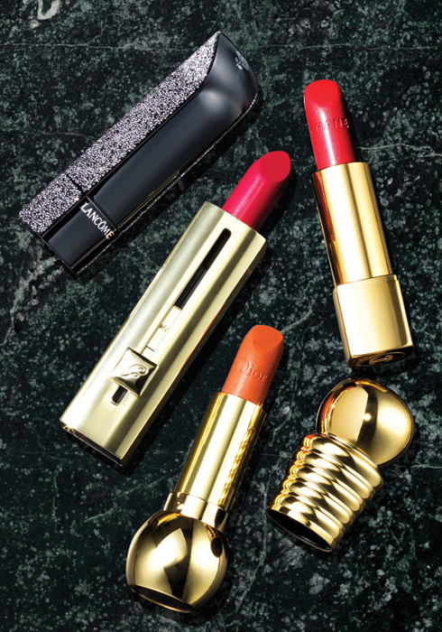 (왼쪽 위부터 시계 방향으로) 랑콤 노엘 컬렉션 압솔뤼 루즈 4.2ml 5만원. 샤넬 루쥬 알뤼르 3.5g 3만9천원. 겔랑 루즈 오토마띠끄 3.5g 4만5천원. |
