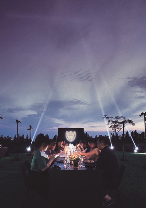 행사의 꽃을 음미하기 위한 ‘본의식’은 더 특별했다. 우선 ‘돔 페리뇽 빈티지 2002 – 플레니튜드 2’를 위한 2차 솔로 테이스팅이 열렸는데, 장소는 인근에 자리한 미술관. 비움의 미학이 묻어나는 건축물의 바닥에는 물이 흐르고, 위로는 하늘을 향해 뚫린 둥글고 커다란 창이 보이는 공간이다. 포도 호텔을 디자인한 한국계 건축가 이타미 준의 작품인데, 15년의 숙성기를 거쳐 빛을 본 돔 페리뇽 빈티지 2002 – 플레니튜드 2를 만나기에 안성맞춤인 장소가 아닐 수 없다. 잔잔한 물을 바라보면서 한 모금, 둥근 창 너머 보이는 푸른 하늘을 감상하면서 또 한 모금. 에너지의 팽창이 최고조에 이르러 절정기를 맞이한 만큼 풍미가 깊고 강렬하다. 그러면서도 조화로움이 더해져 뭐랄까, 포용력도 느껴진다. 해가 지지 않는 빈티지라 불리는 2002년산의 힘일까? 와인메이커 니콜라스 블램피드레인(Nicholas Blampied-Lane)의 설명을 곁들이자면 이해의 완벽한 날씨 덕에 남다른 성숙도를 품게 됐고, 그것이 조화미로 이어졌다고. 그리고 그 균형 잡힌 풍미를 더 북돋는 환상의 도우미는 더 이상 자연도, 건축도 아니었다. 자리를 옮겨, 포도 호텔의 야외 공간에 차려진 영감 넘치는 만찬. 그것도 제주 식재료를 활용한 미슐랭 2스타 셰프 임정식의 손길을 더한 정찬이라면 궁합의 완성도는 보장된 거나 다름없을 터. 샴페인의 영원한 단짝 캐비아 요리를 시작으로 그릴에 익힌 뒤 김치와 뵈르 블랑 소스로 풍미를 더한 전복 요리, 청량감 돋는 성게밥, 제주 멜젓에서 영감을 얻었다는 소스와 채소를 곁들인 항정살 구이. 플레니튜드 2와 다채롭게 어우러지는 메뉴는 오감의 만족도를 한껏 끌어올렸다. 기분 좋은 포만감이 몸을 감싸면 다시 샴페인에 집중하게 되는 법. 특유의 고요한 정취 속에서 홀짝이다 보니 어느새 밤이 무르익고, 문득 하늘을 올려다보게 되었다. 별이 보이지 않아도 어쩐지 윤동주의 명시 ‘별 헤는 밤’이 떠오르는 제주의 밤이다.