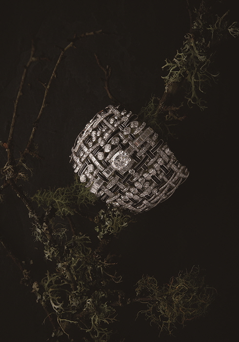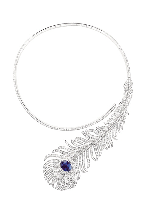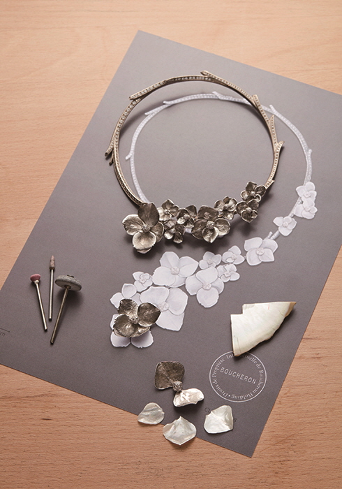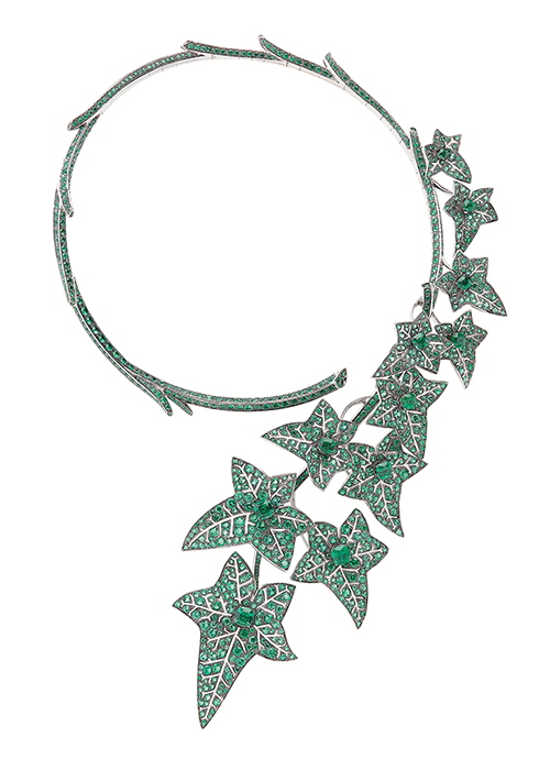 먼저 플럼 드 파옹 네크리스는 자연 모티브를 생동감 넘치는 형태와 유연한 움직임으로 구현해보려는 시도에서 시작되었다. 로즈, 트라이앵글, 브릴리언트, 그리고 바게트 컷 다이아몬드를 세팅해 움직임에 따라 각기 다른 각도로 화려한 빛을 발한다. 19세기 말에 사용하던 세팅과 조정, 금속 작업 기법을 그대로 재현해 만든 것이라는 데 의미가 있다. 깃털 모티브는 분리해서 브로치로도 사용 가능하다. 두 번째로 리에르 드 파리 네크리스는 에메랄드 세팅을 한 움직이는 나뭇잎 모티브가 포인트. 메종의 워크숍 기술을 보여주는 이 나뭇잎 모티브는 크고 작게 움직이는 잔물결의 효과, 배열, 볼륨까지 정확히 계산된 결과물. 여기에 클레어 슈완이 추구하는 극사실주의까지 더했는데, 마치 유럽 고택 벽면의 풍성한 덩굴 한 부분을 떼어 온 듯하다. 이외에도 뉘아쥬 드 플레르 네크리스는 클레어 슈완의 딸이 처음으로 자신에게 선물한 꽃인 수국을 자개로 표현했고, 펄 네크리스는 환상적인 진주 드롭으로 순수한 느낌을 끌어올렸다. 푀유 다캉트 네크리스는 상징적인 장식 모티브를 격자 세공해 굴곡진 나뭇잎을 표현하는 것으로 시선을 사로잡았다. 건축물의 일부 같은 식물 모티브가 모던하고 창조적이다.
