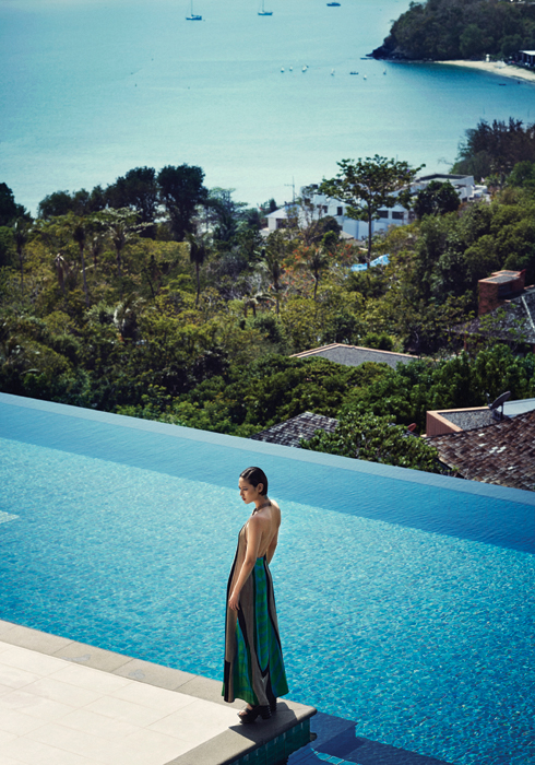 블루 선글라스 트리티, 에스닉 패턴의 블루 롱 드레스 4백 16만원 에트로, 화이트&블루 컬러 리로이(M) 백 53만원 칼린, 그레이 스트랩 슈즈 가격 미정 비비안 웨스트우드. |