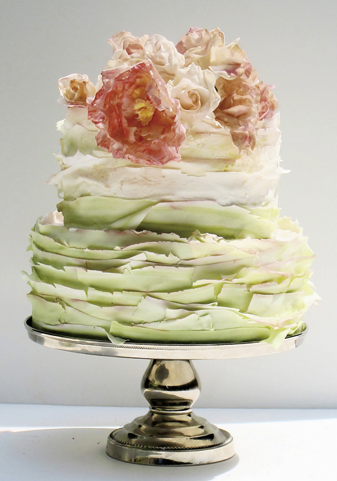 파스텔 그린 컬러의 3층 케이크에 설탕으로 파스타 모양을 만들어 장식했다. 나무랄 데 없는 사랑스러운 디자인이다. fayecahill.com