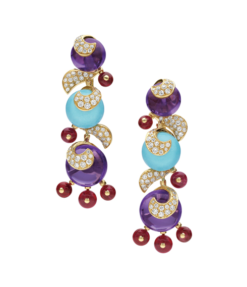 2 옐로 골드 소재에 스피넬, 애미시스트, 터콰이즈와 다이아몬드가 세팅된 신비로운 매력의 이어링.