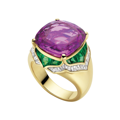 6 옐로 골드 소재에 1개의 사파이어(8.46ct), 에메랄드(1.22ct), 다이아몬드 파베(0.85ct)로 세팅된 볼드한 링.