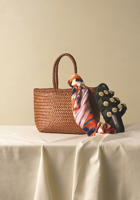 섬세한 위빙 디테일이 돋보이는 드래곤 디퓨전 백 49만5천원, 부드러운 이누이투시 실크 스카프 18만5천원, 데이지 아플리케 장식이 사랑스러운 파브리지오 비티 샌들 73만5천원 모두 폼스튜디오.