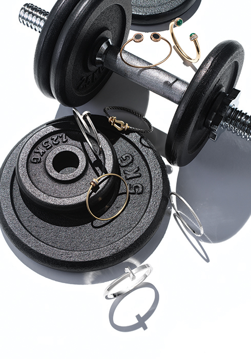 옐로 골드 밴드에 부쉐론의 시그너처인 콰트로 장식을 얹어 모던하고 시크하게 표현한 브레이슬릿. 콰트로 장식에는 11개의 라운드 다이아몬드 0.11캐럿과 화이트 골드, 핑크 골드를 담아 작지만 다채롭게 표현했다. 5백만원대. 문의 02-6905-3322