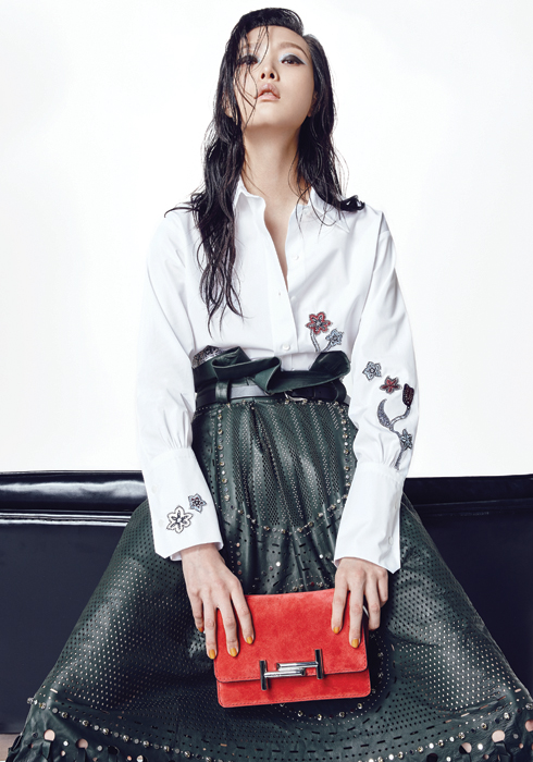 플라워 자수를 더한 화이트 셔츠, 양가죽 소재의 레이저 펀칭 스커트, 블랙 레더 벨트, 스웨이드 소재의 레드 컬러 더블-T 백 모두 토즈. |