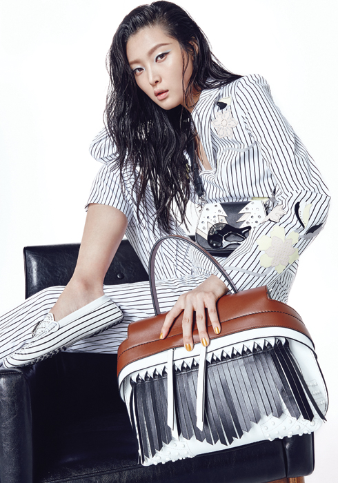 핀스트라이프 재킷과 하이 웨이스트 팬츠, 숄더백으로 연출한 송아지가죽 소재의 더블-T 백, 가죽 프린지 디테일의 웨이브 백, 스트라이프 패턴 고미노 슈즈 모두 토즈. |